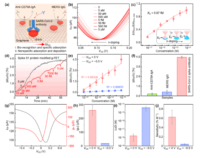 SARS-CoV-2的快速傳播嚴重威脅了公眾健康。建立靈敏的SARS-CoV-2檢測方法對控制全球大流行具有重要意義。在這里,我們開發(fā)了石墨烯場效應(yīng)晶體管(g- FET)生物傳感器,實現(xiàn)了超靈敏的SARS-CoV- 2抗體檢測,檢測限(LoD)低至10