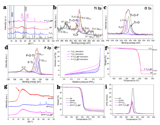 2@P, (g) XRD譜,(h,i) EP及其復(fù)合材料的TGA和DTG譜。