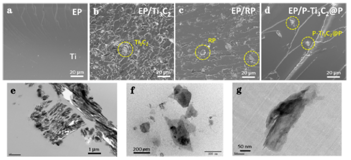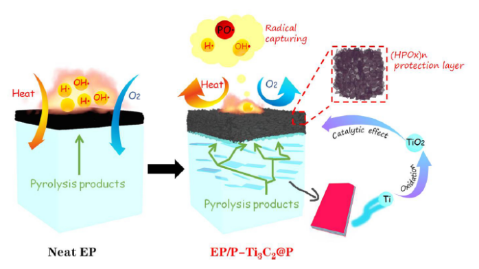 2納米復(fù)合材料。P元素通過(guò)共價(jià)鍵與基質(zhì)緊密連接,提高了RP在存儲(chǔ)和使用期間的安全性問(wèn)題。由于MXenes的多面體特性,納米復(fù)合材料具有廣泛的應(yīng)用前景。作為環(huán)氧樹(shù)脂的阻燃劑,有效地減少了火災(zāi)的發(fā)生。一步剝離形成的納米復(fù)合材料的制備為MXenes的實(shí)際應(yīng)用提供了更可行的途徑。