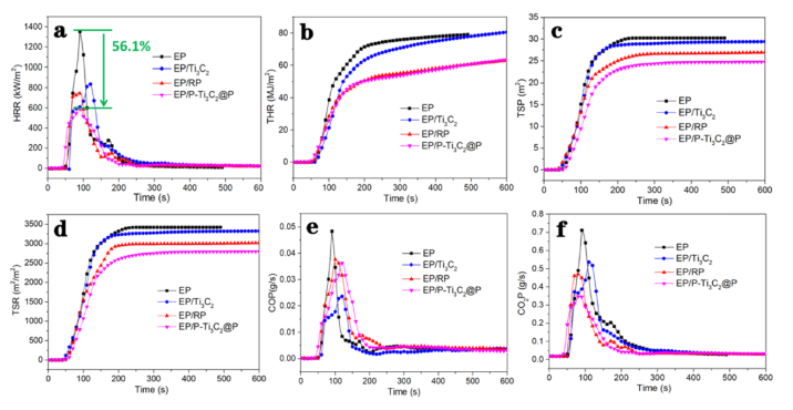 圖6 (a) EP及其復(fù)合材料的HRR曲線,(b) THR曲線,(c) TSP曲線,(d) TSR曲線,(e) COP曲線,(f) CO2P曲線(填料添加量為2 wt %)。