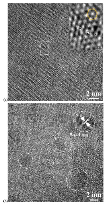 圖2 (a) 3 min和(b) 10 min的HRTEM圖像。(a)中的插圖為白色點矩形放大后的區(qū)域。