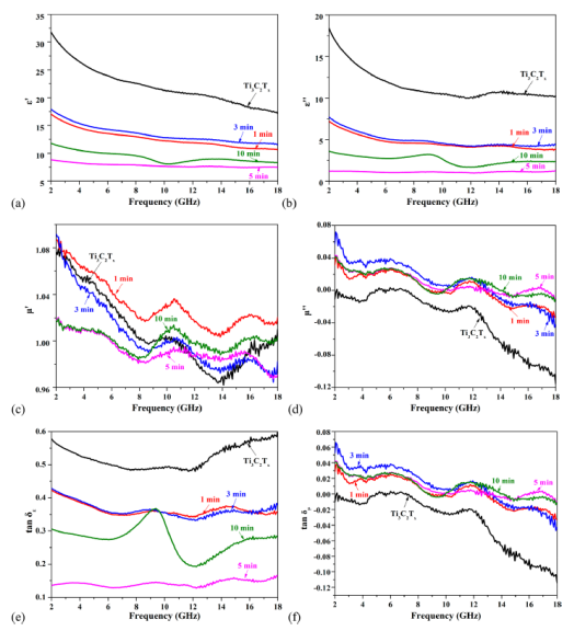 x MXene和氮摻雜產(chǎn)物的EM參數(shù)和(e, f)損耗切線。