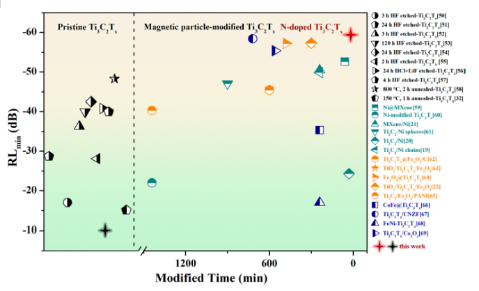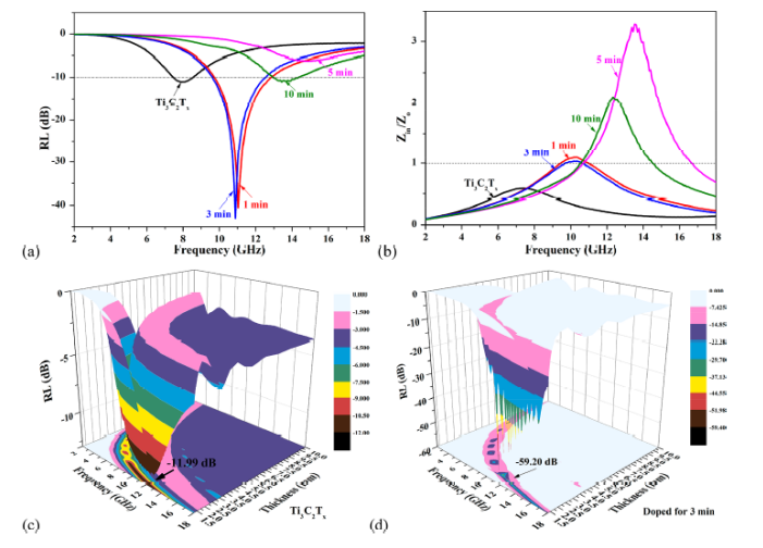 x MXene和氮摻雜產(chǎn)物的RL值(樣品厚度:2 mm)和(b) Z