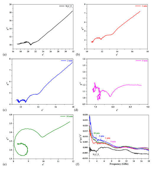 x MXene和氮摻雜產(chǎn)物的Cole Cole曲線和(f) μ″(μ′)−1f−11值。