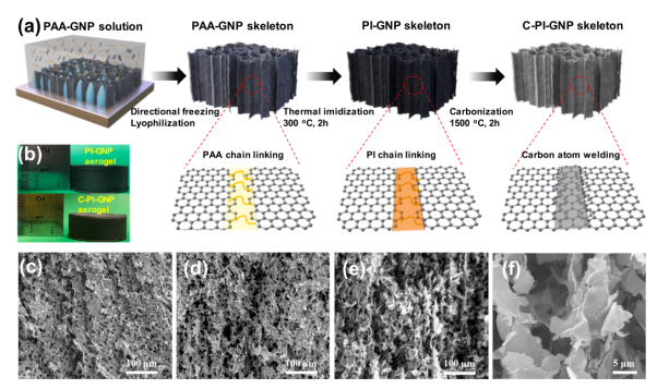 圖1. (a) PAA-GNP、PI-GNP和C-PI-GNP骨架的制作示意圖以及骨架中相應的連接機制;(b) 碳化處理前后PI-GNP骨架的數碼照片;(c)PAA-GNP、(d)PI-GNP和(e,f)C-PI-GNP骨架橫截面的SEM圖像。