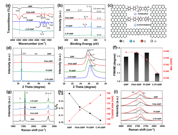 圖2. GNP、PAA-GNP、PI-GNP和C-PI-GNP骨架的(a)FTIR和(b)XPS光譜;(c)亞胺化和碳化過程中分子結構演變的示意圖;GNP、PAA-GNP、PI-GNP和C-PI-GNP骨架的(d)XRD和WAXD(e)模式、(f)相應的半最大值全寬(FWHM)和(0 0 2)d間距;(g)拉曼光譜;(h)I
