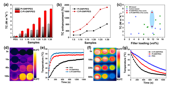 圖3. (a)PI-GNP/PEG和C-PI-GNP/PEG的熱導率和(b)TC增強;(c)導熱系數與報告材料的比較;在加熱和冷卻狀態(tài)時的PEG、PI-GNP/PEG和C-PI-GNP/PEG復合材料的(d、f)紅外熱圖像和(e,g)相應的表面溫度變化。