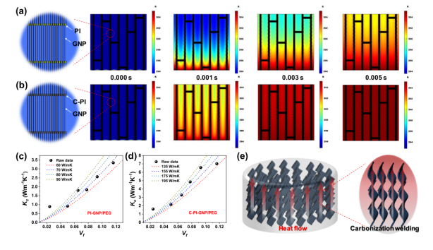 圖4. (a)PI-GNP/PEG和(b)C-PI-GNP/PEG骨架中熱傳導過程的有限元數值模擬。基于(c)PI-GNP/PEG和(d)c-PI-GNP/PEG復合材料的實驗數據,建立具有不同指前因子的模型擬合曲線;(e)C-PI-GNP骨架中熱傳導機制的示意圖。
