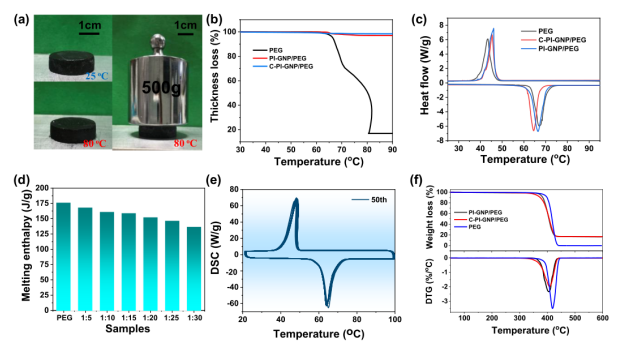 圖5. (a) C-PI-GNP/PEG復合材料在不同條件的熱臺上的數碼照片;(b) 在恒定壓縮載荷(4 N)下厚度隨溫度的變化;(c)PEG、PI-GNP/PEG和C-PI-GNP/PEG復合材料的DSC曲線;(d)不同C-PI-GNP/PEG樣品熔融焓的比較;(e)C-PI-GNP/PEG 1–20樣品的循環(huán)DSC曲線;(f)PEG、PI-GNP/PEG、C-PI-GNP/PEG復合材料的熱穩(wěn)定性。