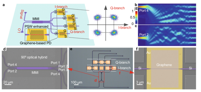 圖1. PSW上帶有石墨烯的OCR。(a)所提出的基于石墨烯的OCR示意圖。GS電極:接地信號電極。(b,c)分別在(b)端口4和(c)端口2的光輸入下MMI耦合器模式圖。(d) MMI耦合器的偽色SEM圖像(90度光混合)。(e)所提出的OCR的光學顯微鏡圖像。在將石墨烯轉移到器件之前拍攝的圖像。(f)PSW PD上石墨烯的偽色SEM圖像。