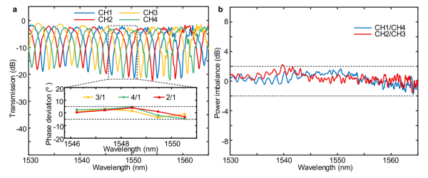 圖2. 90度光混合性能。(a)混合動力中四個輸出端口的測量傳輸。CH表示輸出通道,該數(shù)字與輸出端口數(shù)字對應。插圖:測量混合動力的相位偏差。(b)測量混合動力的功率失衡。藍線(紅線)表示輸出通道1和4(通道2和3)之間的功率失衡。