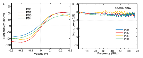 圖3. 石墨烯-PSW PDs的性能。(a)四個PDs在1550 nm處的偏置電壓函數(shù)的響應度。(b)四個PDs的頻率響應。VNA:矢量網(wǎng)絡分析器。