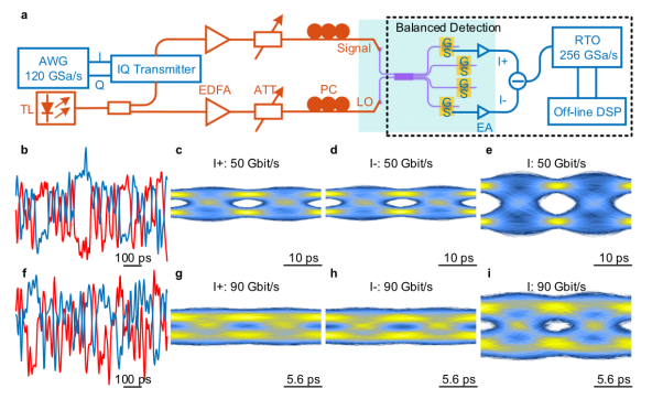 圖4. 平衡檢測測試。(a)平衡檢測的測量裝置。AWG:任意波形發(fā)生器,TL:可調諧激光器,EDFA:摻鉺光纖放大器,PC:偏振控制器,ATT:光衰減器,EA:電放大器,RTO:實時示波器。(b,f) (b)50Gbit/s和(f)90Gbit/s BPSK信號的實時信號波形(藍線代表I+分支,紅線代表I−分支)。(c-e) (c)I+分支,(d)I−分支以及(e)平衡檢測的50 Gbit/s BPSK眼圖。(g–i) (g)I+分支,(h)I−分支以及(i)平衡檢測的90 Gbit/s BPSK眼圖。