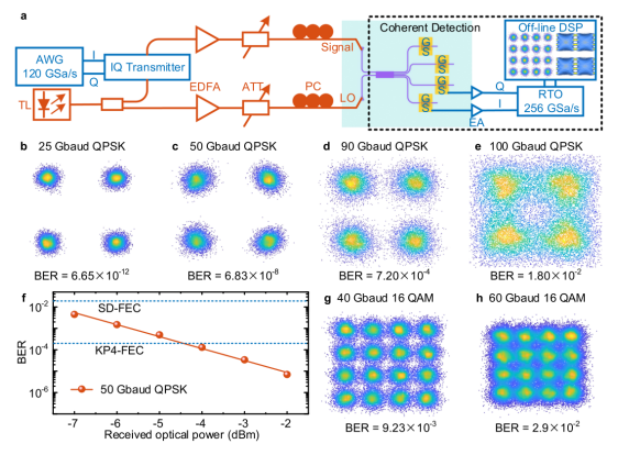 圖5. 相干檢測的實驗演示。(a)相干檢測的測量設置。(b-e) (b)25 Gbaud、(c)50 Gbaud、(d)90 Gbaud和(e)100 Gbaud 的QPSK信號星座圖。(f)50 Gbaud QPSK信號的測量BERs與接收光功率的關系。SD:軟判決。(g-h) (g)40 Gbaud和(h)60 Gbaud的16QAM信號星座圖。