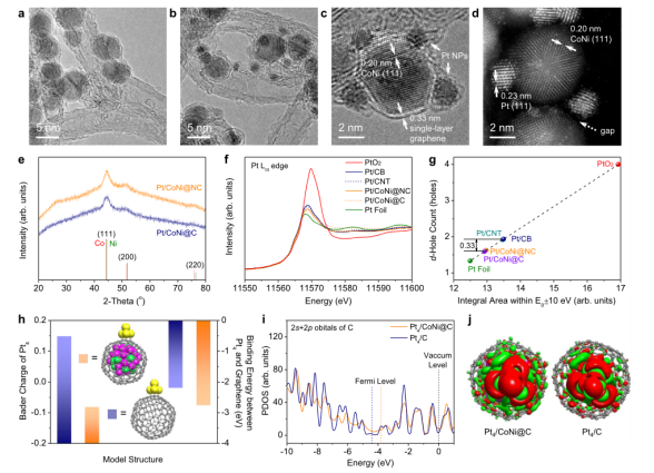 圖1. 石墨烯包覆CoNi合金上Pt的結(jié)構(gòu)表征和建模。(a) CoNi@NC的TEM圖像。(b,c) Pt/CoNi@NC的TEM圖像。(d) Pt/CoNi@NC的HAADF-STEM圖像。(e) Pt/CoNi@NC和Pt/CoNi@C的XRD圖。(f) Pt/CoNi@NC, Pt/CoNi@C, Pt/ CNT,和Pt/CB的Pt L