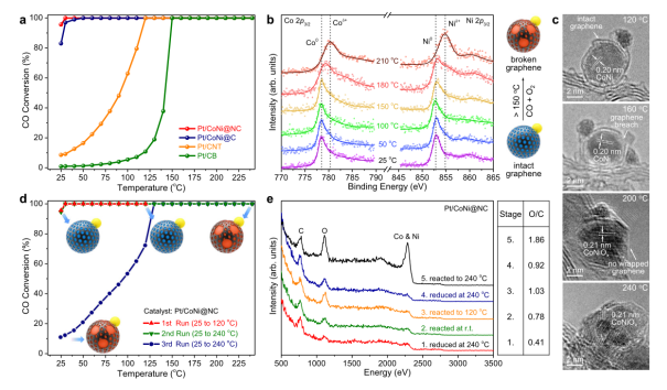 圖2. 用于CO氧化的石墨烯包覆CoNi合金上Pt的結(jié)構(gòu)-活性關(guān)系。(a)預(yù)還原催化劑上CO氧化反應(yīng)中CO轉(zhuǎn)化率的溫度依賴性。He(1 bar)中的1% CO和20% O