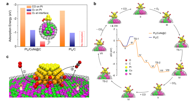 圖3. 石墨烯包覆CoNi合金上Pt催化CO氧化機理的DFT計算。(a)在Pt