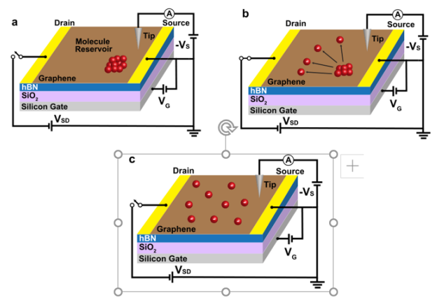 圖 1. 控制石墨烯場(chǎng)效應(yīng)晶體管 (FET) 上的分子濃度。 (a)表示在熱蒸發(fā)到石墨烯 FET 后處于“生長”狀態(tài)的 F4TCNQ 分子構(gòu)型(紅球)的草圖。代表性電路顯示了施加到器件上的偏置。 (b) 向 FET 施加 VG=VG-set 的背柵電壓,同時(shí)流過石墨烯的源極-漏極電流 ISD 導(dǎo)致分子擴(kuò)散到石墨烯表面。VG-set 的典型值范圍為 -60 至 60 V。VSD 的典型值用于將分子濃度范圍從 2 更改為 6 V,典型的 ISD 值范圍為 0.5 至 2 mA。 (c) 當(dāng)源漏電流關(guān)閉時(shí),器件冷卻,分子凍結(jié)在原地。 然后柵極電壓 VGis 返回到 0 V,然后可以使用 VS = 2 V 的樣本偏置(相對(duì)于尖端)和 2 pA 的電流設(shè)置點(diǎn)來穩(wěn)定掃描分子。