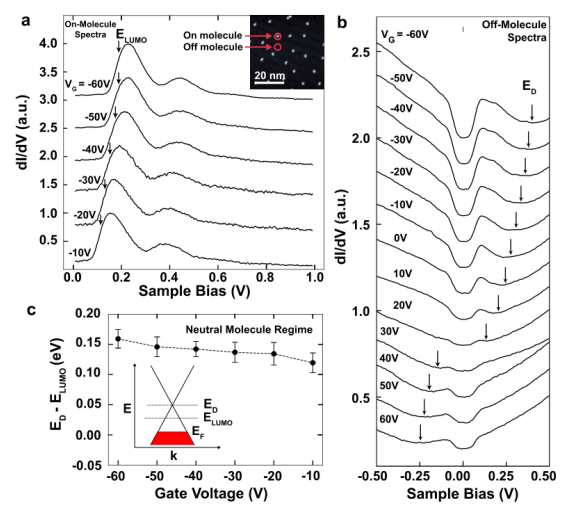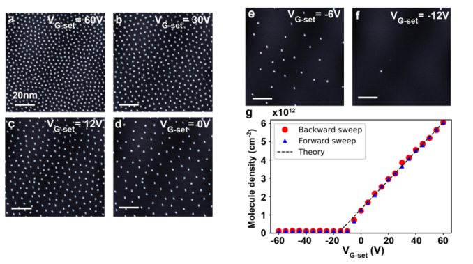 在真空下沉積在干凈表面上吸附物的空間排列通常不能可逆地調(diào)整。 在這里,我們使用掃描隧道顯微鏡來證明沉積在石墨烯場(chǎng)效應(yīng)晶體管 (FET) 上的分子表現(xiàn)出可逆的、電可調(diào)的表面濃度。 在 T = 4.5K 的石墨烯 FET 上實(shí)現(xiàn)了對(duì)帶電 F