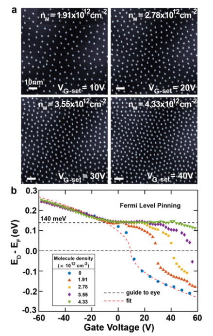 4TCNQ 摻雜石墨烯場(chǎng)效應(yīng)晶體管 (FET) 的費(fèi)米能??級(jí)釘扎:(a) 用不同分子密度裝飾的石墨烯 FET 表面的 STM 圖像,用于測(cè)量 (b) 中所示的分子誘導(dǎo)費(fèi)米能級(jí)釘扎。 (b) 對(duì)于 (a) 中所示的不同分子密度,通過 STS 在石墨烯 FET 表面上測(cè)量的狄拉克點(diǎn)能量 (E