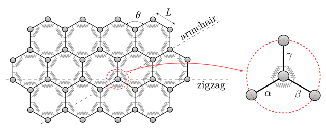 圖1. 石墨烯片被認(rèn)為是一個(gè)桿-彈簧系統(tǒng)和通過在桿的中點(diǎn)放置虛擬原子而獲得的代表性晶胞。