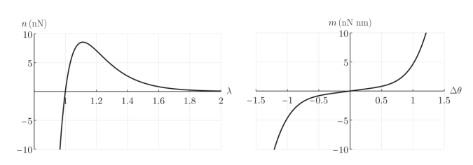 圖2. 桿-彈簧模型元件的本構(gòu)行為。(a)桿的軸向力和縱向拉伸之間的關(guān)系。(b)彈簧的彎矩和鍵角變化之間的關(guān)系。