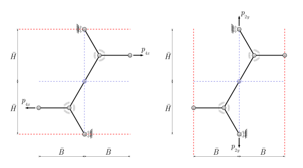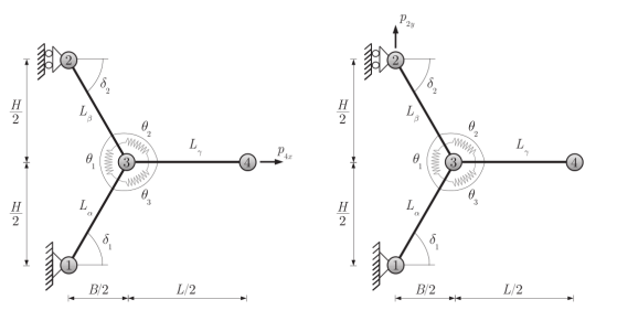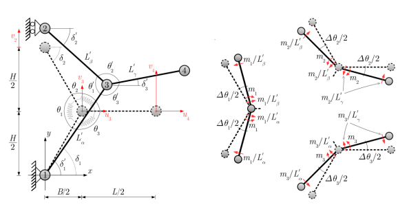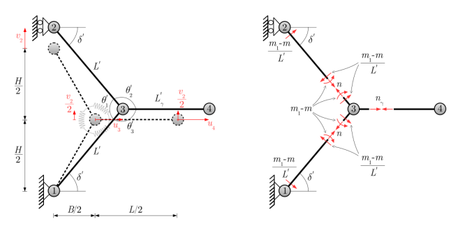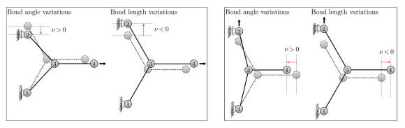 圖4. 對(duì)稱變形情況下石墨烯的代表性晶胞。(a)參考構(gòu)型和變形構(gòu)型。運(yùn)動(dòng)學(xué)簡(jiǎn)化了,現(xiàn)在只由三個(gè)自由度控制。(b)變形構(gòu)型中的內(nèi)部作用。