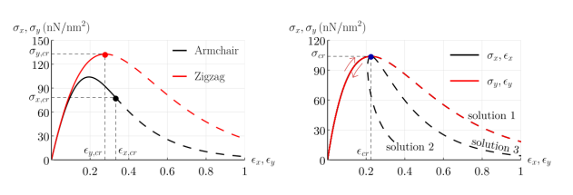 圖13. 石墨烯的穩(wěn)定(實(shí)線)和不穩(wěn)定(虛線)平衡路徑。(a)扶手椅和鋸齒形方向的單軸載荷。(b)等雙軸荷載。