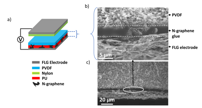 圖3. a)觸點(diǎn)間隔工作模式下使用的TENG結(jié)構(gòu)示意圖。b)和c)顯示了嵌入PVDF膜的摩擦電極的SEM橫截面圖像。