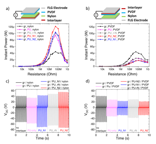 圖4. 兩種設(shè)備配置的TENGs瞬時(shí)輸出功率測(cè)量:a)和c)在正摩擦材料(尼龍)( FLG/ PU_X/nylon // PVDF/FLG)的界面上引入功能性Pu夾層;RMS功率:6.95 μW, PU_N1;8.25µW PU_N2;6.45µW, PU_r-N;6.3µW ,PU-only;無(wú)夾層的TENGs為5µW。b)和d)在與負(fù)摩擦材料(PVDF) (FLG/nylon // PVDF/PU_X/ FLG)的界面處引入夾層。c)和d)達(dá)到V