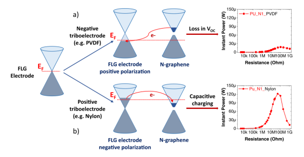 收集所有可獲得的清潔能源是一項(xiàng)重要戰(zhàn)略,有助于消除目前對(duì)不可再生能源的依賴。近年來(lái),摩擦電納米發(fā)電機(jī)作為一種新型的機(jī)械能收集器受到人們的關(guān)注,它是電池的有效替代品,尤其適用于便攜式設(shè)備。在這里,通過(guò)加入氮摻雜石墨烯(N-石墨烯),增加了少層石墨烯基電極的電容,使TENGs的輸出功率提高了3倍。研究了不同類型N-石墨烯的電子性質(zhì)、摻雜濃度以及N-吡啶和N-石墨位的相對(duì)含量對(duì)TENGs性能的影響。這些位點(diǎn)具有不同的電子親和力,并協(xié)同作用于N-石墨烯的電容性和電阻性的變化,從而影響TENG性能。結(jié)果表明,當(dāng)N-石墨烯(一個(gè)N-半導(dǎo)體)與正摩擦電材料和電極界面接觸時(shí),TENG的功率增強(qiáng),而當(dāng)它與負(fù)摩擦電材料界面接觸時(shí),觀察到電性能下降。這種行為可以用N-石墨烯的量子電容對(duì)電極化學(xué)勢(shì)的依賴來(lái)解釋,其通過(guò)在摩擦生電時(shí)在兩個(gè)電極上產(chǎn)生的相反極化而移動(dòng)。