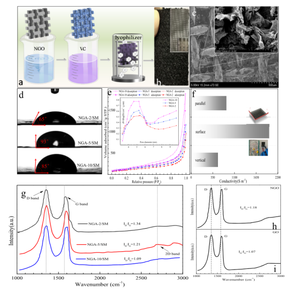 2吸附部分,在孔隙體積中占主導(dǎo)地位的介孔導(dǎo)致位于相對較高壓力下的急劇增加 (P/P0=0.86-0.98)。插圖:使用 BJH 算法的吸附分支計算 NGA-x 的氮吸附和解吸等溫線的孔徑分布 (PSD)。 (f) NGA-5/SM 沿不同切割方向的電導(dǎo)率。 (g) NGA-x/SM 的 514.5 nm 激發(fā)拉曼光譜,(h) N 摻雜氧化石墨烯 (NGO) 和 (i) 制備的 GO。