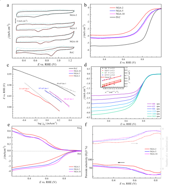 -1掃描,環(huán)電位恒定在1.25 V。(f) 基于 (e) 中相應(yīng)RRDE數(shù)據(jù)的NGA-xat各種電位的過氧化物百分比(實線)和電子轉(zhuǎn)移數(shù)(n)(虛線)。 所有圖都顯示了電位與RHE的關(guān)系。