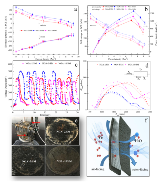 圖 5.(a) 使用NGA/SM陰極的陰極電位比較。 (b) 使用 NGA/SM 空氣陰極的 MFC 的 J-V 曲線和功率密度。(c) 在運行1個月期間,帶有NGA-x/SM 陰極的MFC的電池電壓。 (d) 陰極電位為 0.1 V和 SCE 時 EIS 譜的 Nyquist 圖; 符號代表實驗數(shù)據(jù),線代表與等效電路擬合的數(shù)據(jù)。(e) 運行 73 天后 NGA-x/SM 的面向面的照片。(f) 三相電催化多功能 NGA/SM 的示意圖。