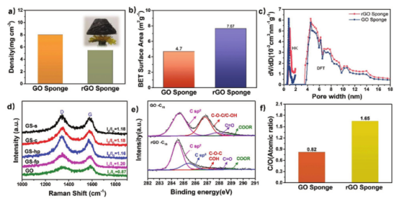 Figure 3.GO和rGO海綿的性能。a)GO和rGO海綿的密度。b,c)GO和rGO海綿的BET表面積和孔徑分布。d)不同單元形狀的rGO海綿的拉曼光譜。e)C 1s XPS光譜和f)GO和rGO海綿的碳/氧原子比。