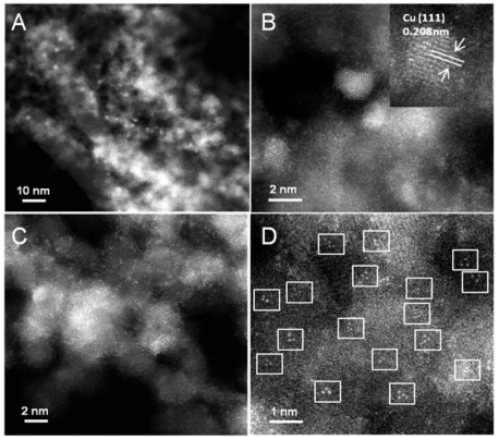Figure 1. Cu-NPs/ND@G 和 Cu3/ND@G 的形態(tài)表征。Cu-NPs/ND@G 在低 (A) 和高 (B) 倍率下的 AC-HAADF-STEM 圖像。Cu3/ND@G 在低 (C) 和高 (D) 倍率下的 AC-HAADF-STEM 圖像。