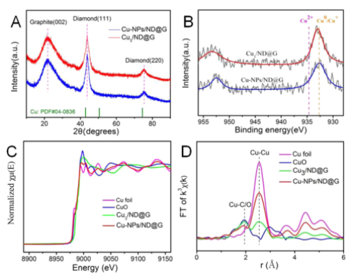 Figure 2. Cu-NPs/ND@G和Cu3/ND@G 的結(jié)構(gòu)表征。(A) Cu-NPs/ND@G 和 Cu3/ND@G 的XRD圖。(B) XPS 光譜。 (C) Cu-NPs/ND@G、Cu3/ND@G、CuO 和Cu箔的Cu K邊緣XANES 光譜和 (D)傅立葉變換 (FT)。