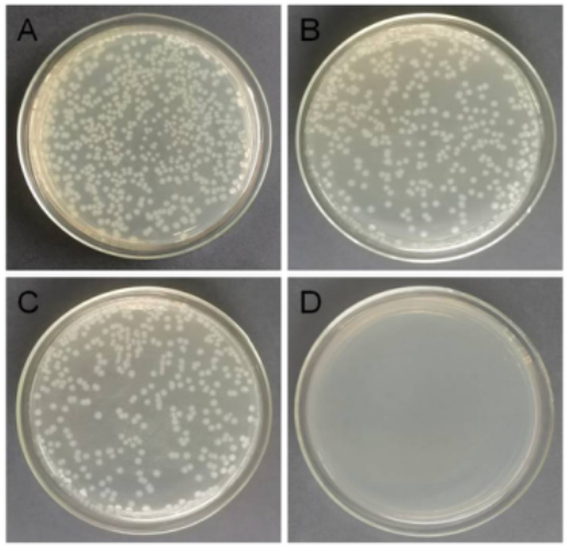 Figure 4.Cu-NPs/ND@G和Cu3/ND@G的抗菌性能。生長抑制試驗:將不同的材料和菌液涂在LB瓊脂平板上,用大腸桿菌培養(yǎng),分別用用(A)空白、(B) ND@G、(C) Cu-NPs/ND@G和(D) Cu3/ND@G處理,培養(yǎng)條件:37℃和24 h。