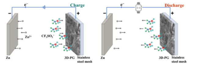 Figure 1. 3D-PG-1陰極和鋅陽極組裝的ZHC工作機制示意圖。