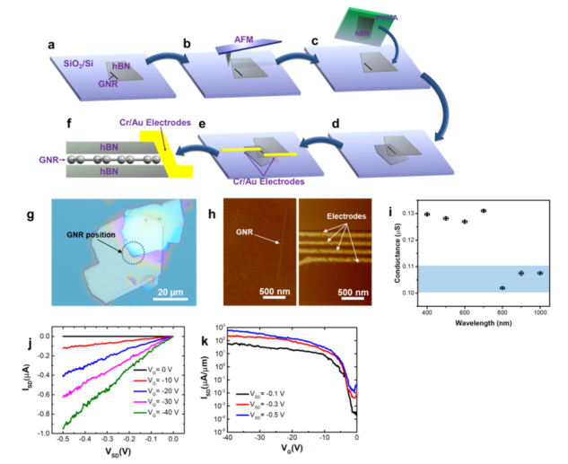 圖 3. h-BN封裝GNR和電氣特性。 (a-f) GNR的h-BN封裝和端鍵合接觸制造工藝的示意圖。 (g) 多層hBN-GNR-hBN 異質(zhì)結(jié)構(gòu)的光學(xué)圖像。 虛線圓圈表示GNR的位置。 (h)所選GNR(左)和帶有四個(gè)電極的制造裝置(右)的AFM圖像。 (i)測(cè)量GNR的電導(dǎo)率作為光激發(fā)波長(zhǎng)的函數(shù),標(biāo)準(zhǔn)導(dǎo)數(shù)作為誤差線。藍(lán)色區(qū)域表示低于電導(dǎo)率的最高測(cè)量暗值的值。(j) 在從0到-40 V 的各種柵極電壓VG下以-10 V的步長(zhǎng)在黑暗中記錄的輸出特性。 (k)在各種源漏電壓 V
