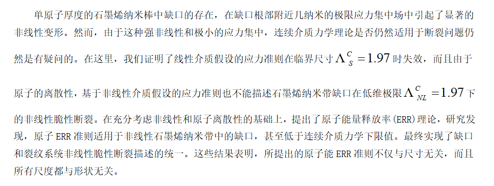 相關(guān)研究成果由哈爾濱工業(yè)大學(xué)航天科學(xué)與力學(xué)系Pengfei Jia等人于2021年發(fā)表在International Journal of Solids and Structures (https://doi.org/10.1016/j.ijsolstr.2021.111260)上。原文:A unified atomic energy release rate criterion for nonlinear brittle fracture in graphene nanoribbons。