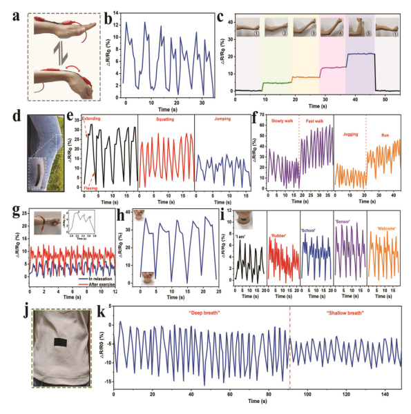 Figure 6.可穿戴式XSBR/SSCNT柔性傳感器的應(yīng)用,用于檢測各種人體動作和聲音。相對阻力隨a)手腕彎曲運動的照片和b)相應(yīng)的信號而變化。c)彎曲肘部。d)裝配在膝關(guān)節(jié)上的傳感器光學(xué)圖像,以及相應(yīng)的e)屈/伸、蹲、跳信號;f)慢走-快走,慢跑-跑。g)柔性應(yīng)變傳感器監(jiān)測腕脈的相對電阻變化。插圖顯示了手腕上的傳感器(左)和單個脈沖信號(右)的照片。h)監(jiān)測微笑微小肌肉運動時傳感器信號的響應(yīng)性。插圖:撲克臉和微笑臉的照片。i)當(dāng)佩戴者說“我是”、“橡膠”、“學(xué)校”、“傳感器”、“歡迎”時的發(fā)音。“j)附著在腹部的傳感器的光學(xué)圖像,以及k)兩種不同呼吸模式,深呼吸和淺呼吸的相應(yīng)信號。