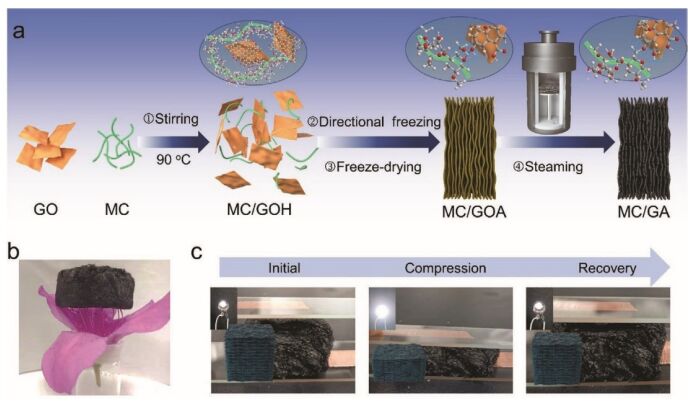 Figure 1. MC/GA的制作工藝及光學(xué)圖像。a)描述MC/GA四步制作過(guò)程的原理圖;b)由花蕊支撐的MC/GA的光學(xué)圖像,顯示其密度低;c) MC/GA的光學(xué)圖像,經(jīng)過(guò)一個(gè)周期的壓縮和恢復(fù),并伴隨著LED的照明變化。