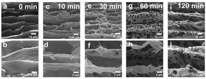 Figure 3. 不同蒸煮時(shí)間的MC/GA-1的SEM圖像。a、b) 0分鐘;c, d) 10分鐘;e、f) 30分鐘;g h) 60分鐘;i, j) 120分鐘。