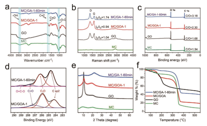 Figure 4. MC、GO、MC/GOA-1和MC/GA-1-60 min的化學(xué)微觀結(jié)構(gòu)和熱性能。a) FT-IR, b) Raman, c) XPS, e) GO、MC/GOA-1和MC/GA-1-60 min的XRD譜;d) MC/GOA-1和MC/GA-1-60 min的高分辨率XPS C 1s光譜;f) MC、GO、MC/GOA-1、MC/GA-1-60 min的TG曲線。