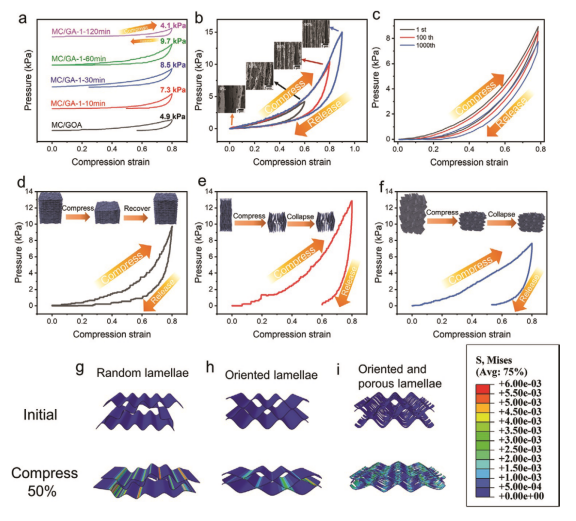 Figure 5. MC/GA-1的各向異性力學(xué)和回彈性能。a) MC/GOA-1和MC/GA-1在5 mm/min轉(zhuǎn)速下的壓縮力學(xué)性能;b) MC/ GA -1- 60min的壓縮力學(xué)性能隨壓縮應(yīng)變的變化,插入:MC/ GA -1- 60min在ε= 0%、60%、80%和90%狀態(tài)下的SEM圖像;c) MC/ GA -1- 60min在2 mm/min轉(zhuǎn)速下的循環(huán)壓縮性能;MC/ GA -1- 60min的壓縮力學(xué)性能:d)法向,e)與片層平行,插入:壓縮方向示意圖;f)各向同性MC/GA的壓縮力學(xué)性能,插入:壓縮方向示意圖;g)隨機(jī)排列、h)有序排列和i)有序多孔片層的氣凝膠壓縮應(yīng)力有限元分析。