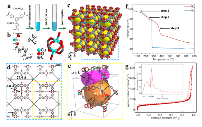 圖2 (a)合成示意圖;(b) AU和Cu槳輪;(c)三維分子填充圖;(d)沿b軸查看; (e)單個(gè)單元細(xì)胞中的空腔;(f) TGA曲線;(g) Cu-BTB的N
