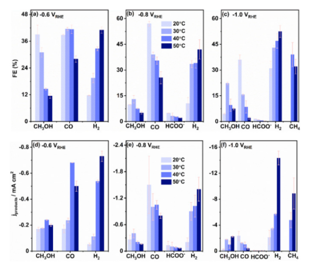 Figure 2. CoTPP/MWCNT的產物分析。(a-c)在所研究的溫度范圍內不同電壓下,所有檢測產物的法拉第效率(帶誤差線)和(d-f)部分電流密度(帶誤差線)。