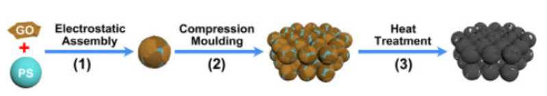 Figure 1. 具有3D相互交錯多孔結(jié)構(gòu)的獨立式氮摻雜石墨烯膜電極(F-N-GPM)的制備過程示意圖。