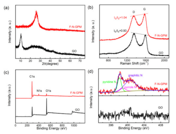 Figure 3.原始GO片和F-N-GPM樣品的(a)XRD圖譜,(b)拉曼光譜,(c)測量XPS總譜和(d)高分辨N1s XPS光譜。